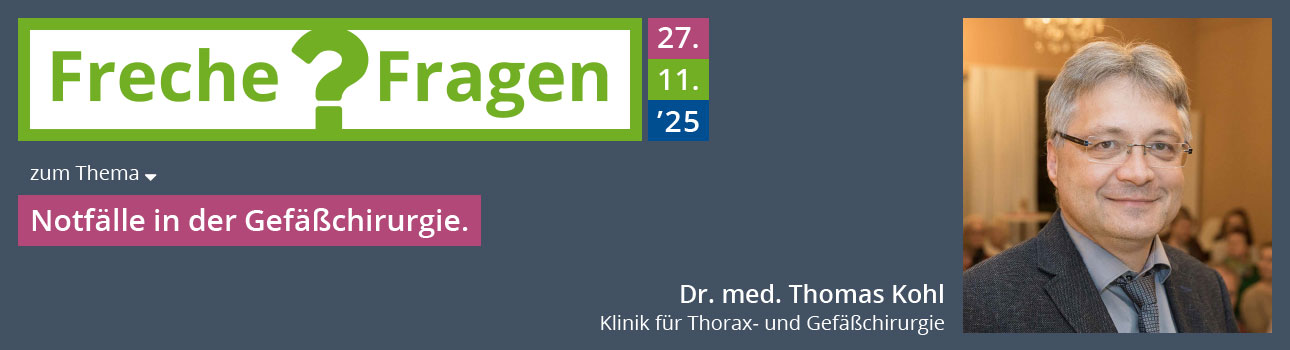Bad Berka/Erfurt, 24. November 2025 --- Die „Frechen Fragen“ an Chefärzte im Erfurter Haus Dacheröden beschäftigen sich in dieser Woche mit Notfällen in der Gefäßchirurgie. Der dazugehörige Vortrag von Dr. med. Thomas Kohl, Chefarzt der Klinik für Thorax- und Gefäßchirurgie beginnt am 27. November 2025 um 19 Uhr.