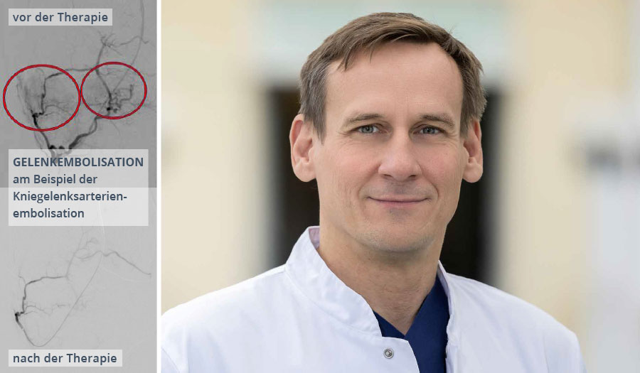 Bei dem Eingriff in örtlicher Betäubung werden über einen Hautschnitt von 5 mm feine Kathetermaterialien über die Arterien unter Kontrolle mit einem Röntgengerät (Angiographie) zu den pathologischen Gefäßen gesteuert und verschlossen. Ziel ist es, die verstärkte Durchblutung im Bereich der Gelenkinnenhaut, wodurch die Entzündungsreaktion und damit der Schmerz aufrecht erhalten werden, zu stoppen. „Es gibt Studien, die eine Besserung von bis zu 2 Jahren nachgewiesen haben. Es kann natürlich auch länger sein, die Daten fehlen noch, weil das Verfahren recht jung ist. Was wir ebenfalls noch nicht wissen, ist auch die mögliche Wirkung bei einem Wiederholungseingriff“, so PD Dr. Mensel.