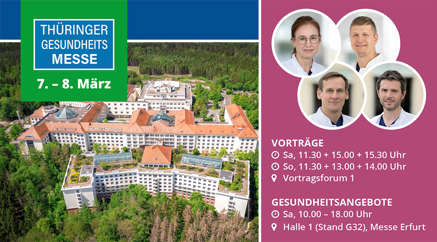 Bad Berka, 02. März 2026 --- Die Zentralklinik Bad Berka präsentiert sich auf der Gesundheitsmesse am Wochenende in Erfurt. Am Samstag und Sonntag können sich Besucher von 10 bis 18 Uhr am Stand (G32, Halle 1) über das medizinische Angebot informieren. Geboten werden u. a. auch Einblicke in den menschlichen Körper, Parcours mit Spezialbrillen, die simulieren, wie die Sinnesorgane auf Alkohol- und Drogenkonsum reagieren und viele weitere Informationsmöglichkeiten rund um die Gesundheit.